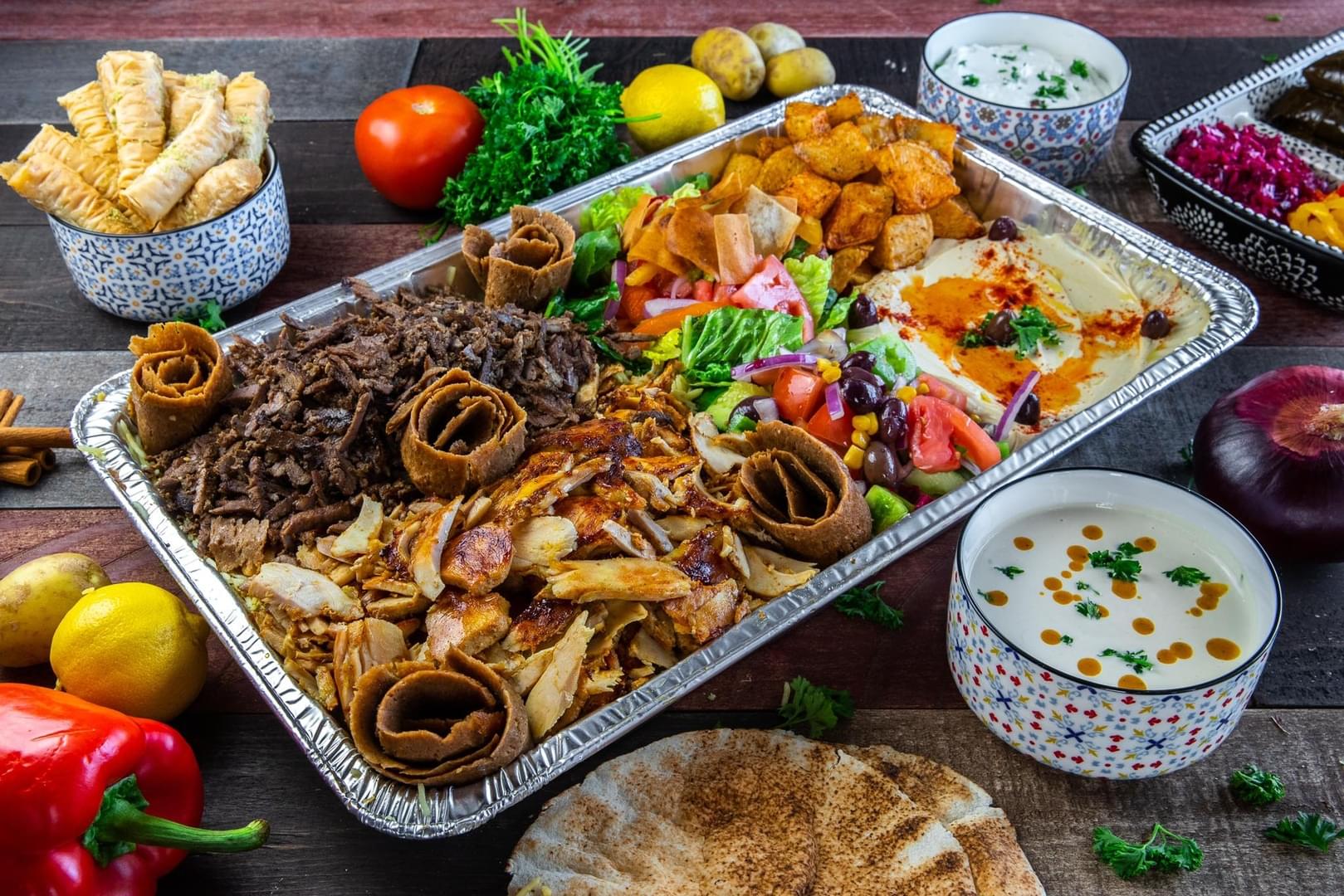 You're gonna need two hands to hold our pitas. Slowly roasted, thinly sliced chicken and beef that are seasoned with Middle Eastern spices stuffed in a fresh pita topped
